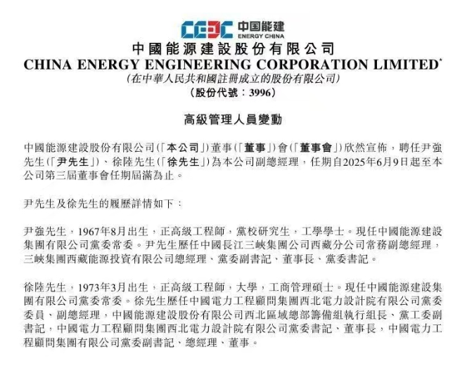 經(jīng)中國(guó)能建第三屆董事會(huì)提名委員會(huì)第十次會(huì)議審核和第三屆董事會(huì)第四十七次會(huì)議審議通過,同意聘任尹強(qiáng)先生、徐陸先生為公司副總經(jīng)理,任期自本次董事會(huì)批準(zhǔn)之日起至公司第三屆董事會(huì)任期屆滿止。