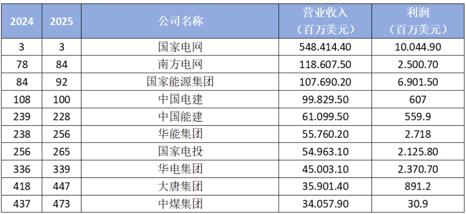 7月29日,2025年《財富》世界500強放榜,此次上榜門檻(最低銷售收入)從321億美元增長至322億美元。除國家電網(wǎng)外,電力央企排名均有小幅變化。