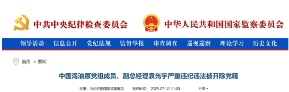 中央紀(jì)委國家監(jiān)委網(wǎng)站訊 經(jīng)中共中央批準(zhǔn),中央紀(jì)委國家監(jiān)委對中國海洋石油集團(tuán)有限公司原黨組成員、副總經(jīng)理袁光宇嚴(yán)重違紀(jì)違法問題進(jìn)行了立案審查調(diào)查。