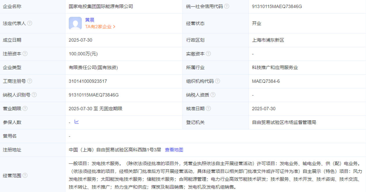 7月30日,國家電投集團(tuán)國際能源有限公司成立,法定代表人為黃晨,注冊資本100000萬人民幣,由國家電力投資集團(tuán)有限公司全資持股。