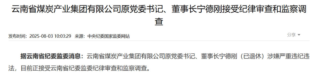據(jù)云南省紀委監(jiān)委8月3日消息,云南省煤炭產(chǎn)業(yè)集團有限公司原黨委書記、董事長寧德剛(已退休)涉嫌嚴重違紀違法,目前正接受審查調(diào)查。