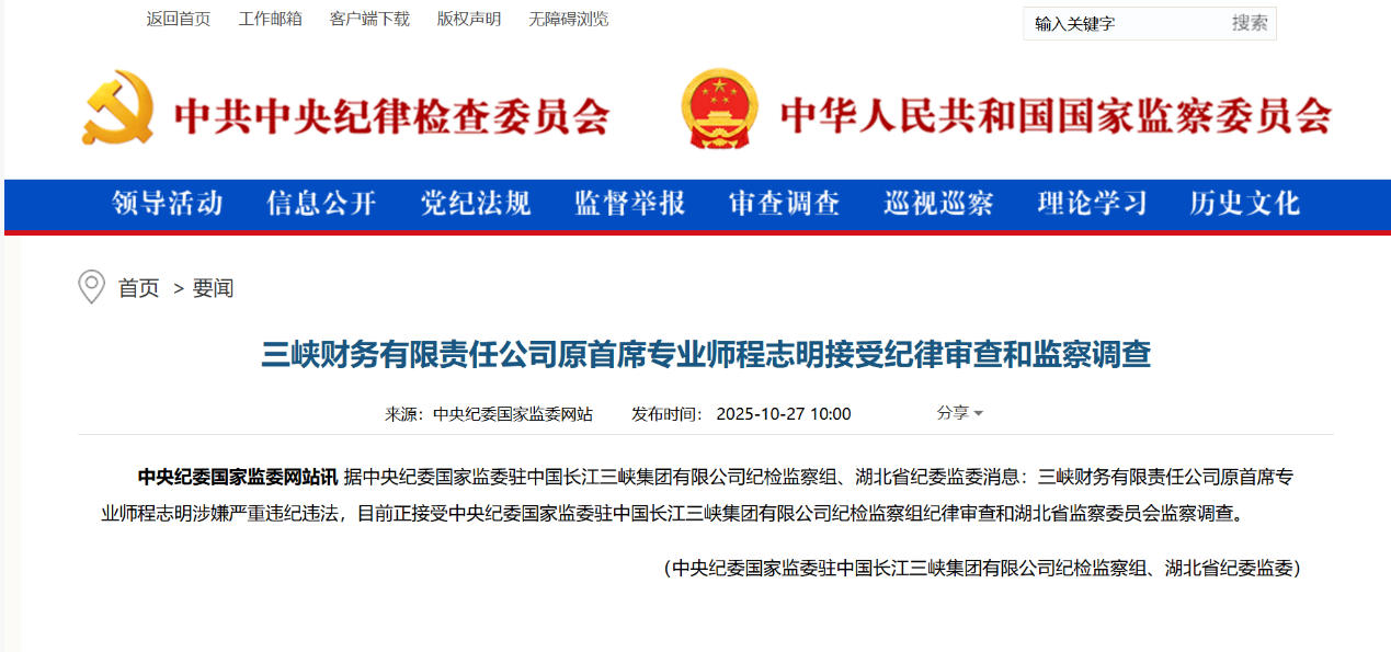 10月27日,中央紀委國家監(jiān)委網(wǎng)站信息顯示,據(jù)中央紀委國家監(jiān)委駐中國長江三峽集團有限公司紀檢監(jiān)察組、湖北省紀委監(jiān)委消息:三峽財務(wù)有限責任公司原首席專業(yè)師程志明涉嫌嚴重違紀違法,目前正接受中央紀委國家監(jiān)委駐中國長江三峽集團有限公司紀檢監(jiān)察組紀律審查和湖北省監(jiān)察委員會監(jiān)察調(diào)查。