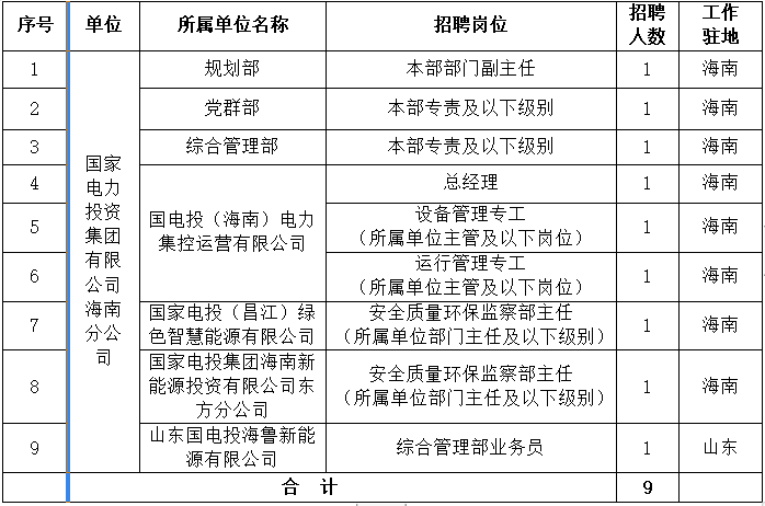 詳見《國家電力投資集團(tuán)有限公司海南分公司所屬單位招聘崗位職責(zé)及任職條件》(附件1)。