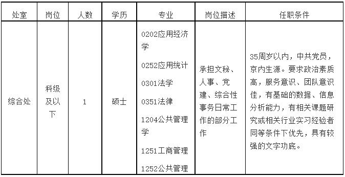 綜合處主任科員及以下崗位1人(京內(nèi)生源的碩士應(yīng)屆畢業(yè)生)。35周歲以內(nèi),中共黨員,要求政治素質(zhì)高,服務(wù)意識(shí)、團(tuán)隊(duì)意識(shí)佳,有基礎(chǔ)的數(shù)據(jù)、信息分析能力,同等條件下有相關(guān)課題研究或相關(guān)行業(yè)實(shí)習(xí)經(jīng)驗(yàn)者優(yōu)先,具有較強(qiáng)的文字功底。具體要求詳見下表。