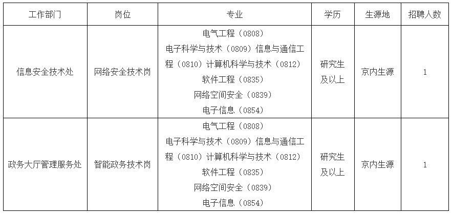 2.政務大廳管理服務處:智能政務技術崗工作人員1名(京內(nèi)生源研究生及以上應屆畢業(yè)生)。專業(yè)為電氣工程(0808)、電子科學與技術(0809)、信息與通信工程(0810)、計算機科學與技術(0812)、軟件工程(0835)、網(wǎng)絡空間安全(0839)、電子信息(0854)。要求作風正派、嚴謹細致、踏實肯干,責任心強、執(zhí)行力強、服務意識強,具有較強的溝通協(xié)調能力和文字功底。