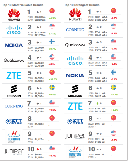 英國知名品牌評估機構(gòu)Brand Finance(英國品牌金融咨詢公司)發(fā)布《Telecoms 150 2020》年度報告,列出了全球十大最有價值和十大最強大的電信基礎(chǔ)設(shè)施品牌,中天科技同時位列兩榜第8名。