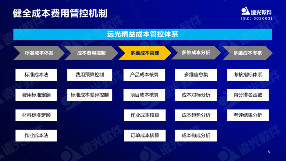 結(jié)合《指導(dǎo)意見(jiàn)》內(nèi)容,谷勇成介紹了遠(yuǎn)光精益成本管控體系的產(chǎn)品理念。他指出,遠(yuǎn)光精益成本管控體系主要包括“標(biāo)準(zhǔn)成本體系、成本費(fèi)用控制、多維成本管理、成本分析及成本考核”五大方面,和國(guó)資委的《指導(dǎo)意見(jiàn)》要求高度匹配。通過(guò)歷史成本、市場(chǎng)價(jià)格等參考信息建立企業(yè)標(biāo)準(zhǔn)成本體系,構(gòu)建成本預(yù)測(cè)/決策模型;通過(guò)成本與費(fèi)用控制,實(shí)現(xiàn)對(duì)“料、工、費(fèi)”發(fā)生過(guò)程的全面管控;通過(guò)多維成本管理與目標(biāo)成本管理結(jié)合,進(jìn)行多維度組合成本歸集、分?jǐn)偱c結(jié)轉(zhuǎn),得出實(shí)際成本以與目標(biāo)(計(jì)劃)成本作比較和分析,同時(shí)引入同業(yè)對(duì)標(biāo)或國(guó)際對(duì)標(biāo),尋找成本差異及原因;通過(guò)標(biāo)準(zhǔn)成本體系及成本定額標(biāo)準(zhǔn)(標(biāo)準(zhǔn)單價(jià)*標(biāo)準(zhǔn)業(yè)務(wù)量)的制訂,結(jié)合預(yù)算管理中的控制功能,對(duì)各項(xiàng)費(fèi)用性開(kāi)支和非生產(chǎn)性支出進(jìn)行嚴(yán)格控制,以聚焦主業(yè)生產(chǎn),提高質(zhì)效;通過(guò)考評(píng)管理體系、考評(píng)指標(biāo)體系、考評(píng)計(jì)算函數(shù)、得分計(jì)算及排名分析等功能,以實(shí)現(xiàn)組織、員工、成本對(duì)象等不同維度的考核評(píng)價(jià),以激發(fā)企業(yè)和員工活力。