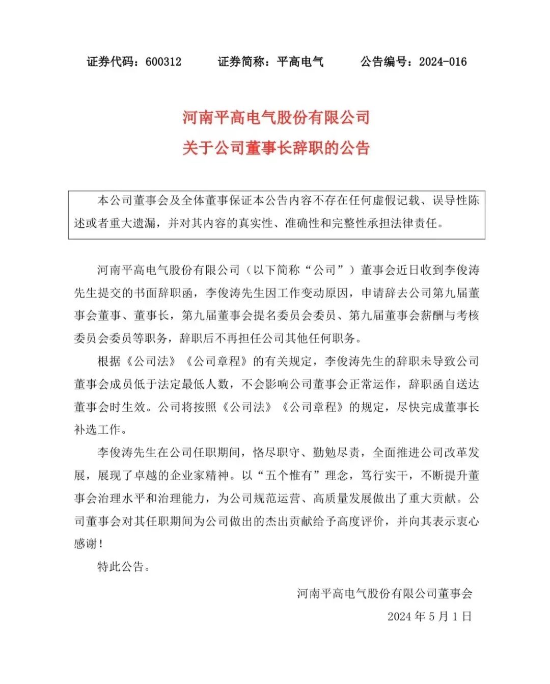 5月1日,平高電氣發(fā)布公告稱,公司董事會(huì)近日收到李俊濤先生提交的書面辭職函,李俊濤先生因工作變動(dòng)原因,申請(qǐng)辭去公司第九屆董事會(huì)董事、董事長,第九屆董事會(huì)提名委員會(huì)委員、第九屆董事會(huì)薪酬與考核委員會(huì)委員等職務(wù),辭職后不再擔(dān)任公司其他任何職務(wù)。