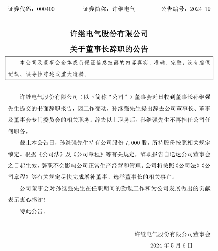 5月5日,許繼電氣發(fā)布公告,董事會近日收到董事長孫繼強(qiáng)提交的書面辭職報告,因工作變動,孫繼強(qiáng)提出辭去公司董事長、董事及董事會專門委員會的相關(guān)職務(wù)。