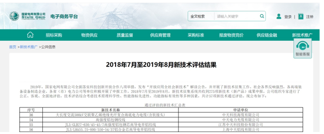 近日,國家電網(wǎng)公司發(fā)布了2018-2019年新技術(shù)(新產(chǎn)品)評估結(jié)果,中天海纜“大長度交流500kV交聯(lián)聚乙烯絕緣光纖復合海底電力電纜(含軟接頭)”、中天電力光纜 “高強度鋁包鋼絞線”、中天科技“JL3/GLB27-630/45-45/7高強度鋁包鋼芯高導電率鋁絞線”、中天鋁線“JL3/LHA55.25-800/550-54/37鋁合金芯高導電率鋁絞線”4項新技術(shù)(新產(chǎn)品)入選。