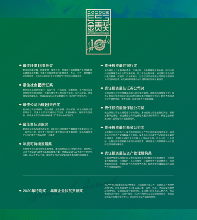 本次評選設(shè)置有最佳環(huán)境(E)責(zé)任獎、最佳社會(S)責(zé)任獎、最佳公司治理(G)責(zé)任獎、最佳責(zé)任進取獎、年度可持續(xù)發(fā)展獎、責(zé)任投資最佳銀行獎、責(zé)任投資最佳證券公司獎、責(zé)任投資最佳保險公司獎、責(zé)任投資最佳基金公司獎、責(zé)任投資最佳資產(chǎn)管理機構(gòu)獎十個大獎。此外,2020年是決勝全面建成小康社會、決戰(zhàn)脫貧攻堅之年,評選特別增設(shè)企業(yè)扶貧貢獻獎。獎項候選名單是基于企業(yè)公開信息、新聞輿情等資料及權(quán)威數(shù)據(jù)庫綜合評估后所得。