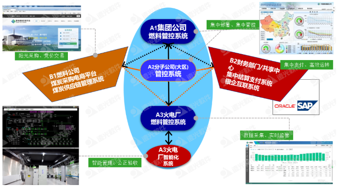 在縱向貫通方面,通過在集團(tuán)公司總部部署燃料管控信息系統(tǒng),以集中部署、集中管控為實(shí)施原則,發(fā)揮集團(tuán)公司的計(jì)劃管理和實(shí)施監(jiān)督的管理職能。在分(子)公司部署燃料管控系統(tǒng),作為燃料縱向三級(jí)管控中承上啟下的“橋梁”,對(duì)下屬電廠采購、入廠、結(jié)算實(shí)施監(jiān)管,同時(shí)進(jìn)行區(qū)域內(nèi)調(diào)控;協(xié)助集團(tuán)公司進(jìn)行保供控價(jià)的執(zhí)行,落實(shí)集團(tuán)對(duì)燃料指標(biāo)管控要求。在電廠部署燃料管控信息系統(tǒng)(A2)與燃料智能化系統(tǒng)(A3),作為燃料管控的執(zhí)行主體,內(nèi)容包括入廠計(jì)量過程智能化系統(tǒng)、采制樣過程智能化系統(tǒng)、化驗(yàn)管理網(wǎng)絡(luò)化系統(tǒng)、煤場(chǎng)管理數(shù)字化系統(tǒng)、入爐煤管理系統(tǒng)、門禁系統(tǒng)、燃料集中監(jiān)控系統(tǒng)和監(jiān)控中心、燃料業(yè)務(wù)管理系統(tǒng)。