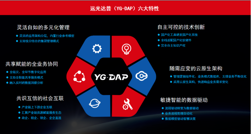 遠(yuǎn)光DAP是遠(yuǎn)光軟件以“助力企業(yè)數(shù)字化轉(zhuǎn)型升級”為目標(biāo)研發(fā)推出的新一代企業(yè)數(shù)字核心應(yīng)用系統(tǒng),采用“云原生”技術(shù),按照“全棧國產(chǎn)化、組件式接入、全業(yè)務(wù)協(xié)同、嵌入型分析、服務(wù)化運(yùn)營”的設(shè)計理念,建設(shè)“戰(zhàn)略規(guī)劃、資源管理、生產(chǎn)經(jīng)營、共享服務(wù)、數(shù)據(jù)運(yùn)營”五大核心應(yīng)用,以數(shù)據(jù)驅(qū)動業(yè)務(wù)管理,以智能支撐戰(zhàn)略決策,促進(jìn)產(chǎn)業(yè)互聯(lián)、社會互聯(lián)生態(tài)構(gòu)建。