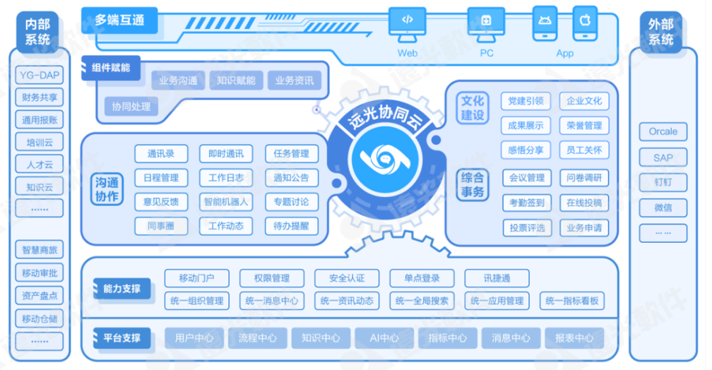 以移動端協(xié)同為核心,融合內(nèi)外部應用,打造智能化辦公平臺,構建社交化、移動化、云化、智能化的協(xié)作創(chuàng)新生態(tài)圈。