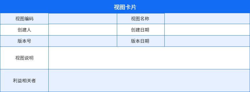 視圖卡片是關(guān)于視圖元信息的描述,通過(guò)視圖卡片可以了解視圖編碼、名稱(chēng)、版本號(hào)、創(chuàng)建人、視圖描述和視圖的利益相關(guān)者。