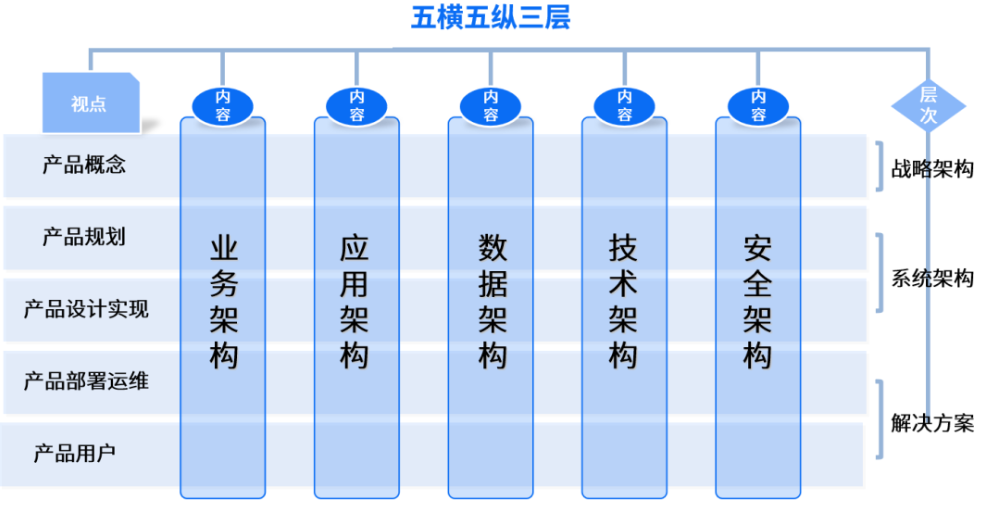 五縱,即縱向包括的五大架構(gòu)設(shè)計(jì)——業(yè)務(wù)架構(gòu)、應(yīng)用架構(gòu)、數(shù)據(jù)架構(gòu)、技術(shù)架構(gòu)、安全架構(gòu)。