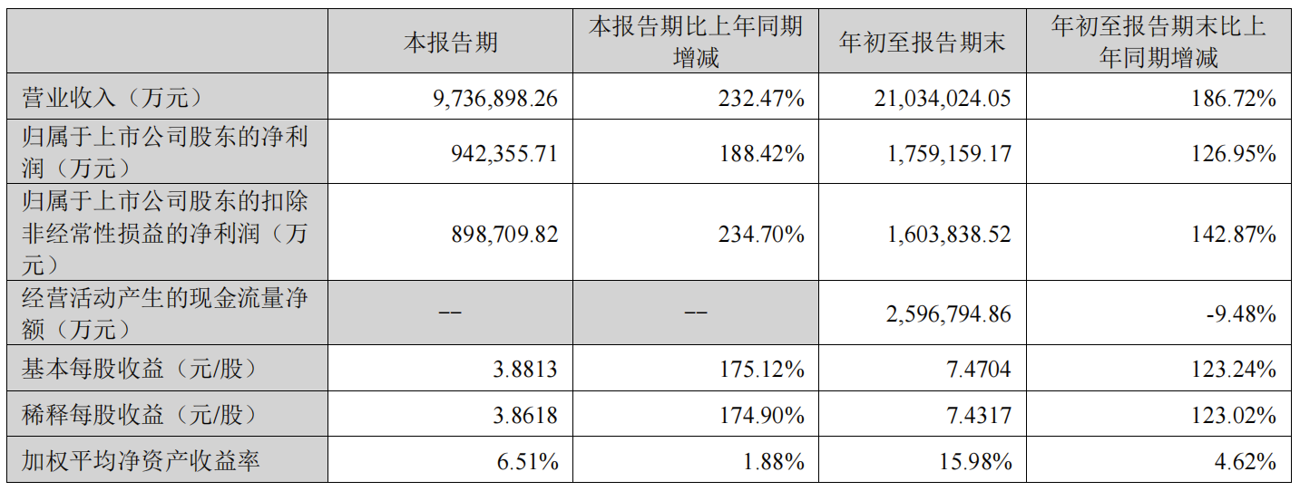 歸屬上市公司股東凈利潤(rùn)突破94億元,較上年同期增長(zhǎng)188.42%,而今年上半年累計(jì)81.68億元,創(chuàng)下寧德時(shí)代單季度歸母凈利潤(rùn)歷史新高。