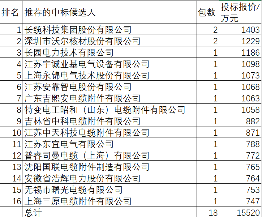長纜科技、沃爾核材中標2包,其余供應商中標1包。中標金額分布較為均衡,10家過800萬元,8家過1000萬元,長纜科技最高,1403萬元,三原電纜附件最低,747萬元。具體情況如下:第1的長纜科技集團股份有限公司中2包1403萬元,占總金額的9.0%。第2的深圳市沃爾核材股份有限公司中2包1229萬元,占總金額的7.9%。