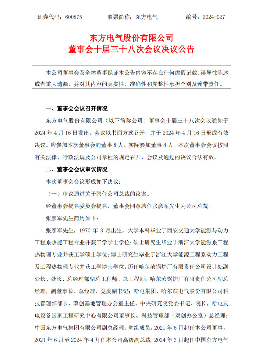 張彥軍任東方電氣股份有限公司(以下簡(jiǎn)稱“東方電氣”)總裁。