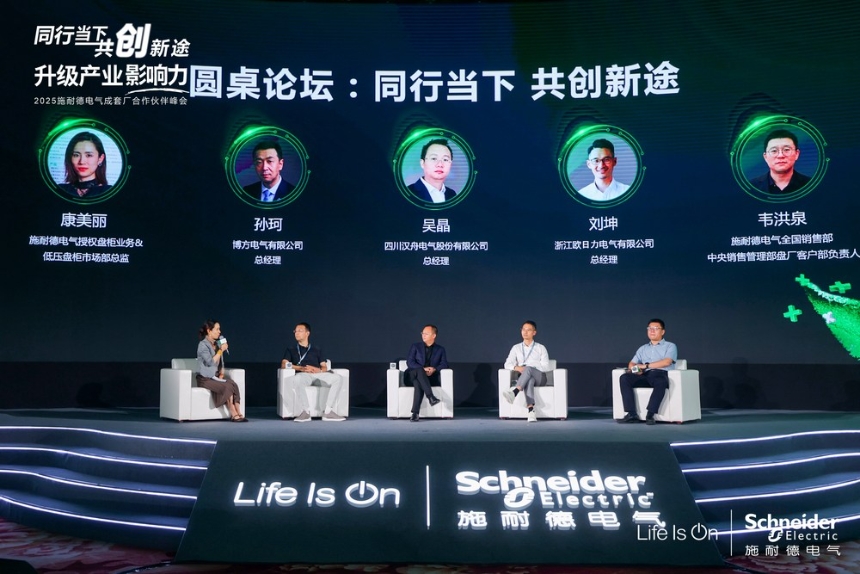 峰會現(xiàn)場,在以“同行當(dāng)下,共創(chuàng)新途”為主題的圓桌論壇中,博方電氣有限公司總經(jīng)理孫珂、四川漢舟電氣股份有限公司總經(jīng)理吳晶、浙江歐日力電氣有公司總經(jīng)理劉坤、施耐德電氣授權(quán)盤柜業(yè)務(wù)&低壓盤柜市場部總監(jiān)康美麗、施耐德電氣全國銷售部中央銷售管理部盤廠客戶部負(fù)責(zé)人韋洪泉齊聚一堂,共同探討行業(yè)發(fā)展新趨勢,詳細(xì)分享與施耐德電氣聯(lián)合創(chuàng)新合作經(jīng)驗(yàn),為行業(yè)轉(zhuǎn)型提供可復(fù)制、可落地的實(shí)踐案例,合力打造更具韌性與創(chuàng)新活力的協(xié)作生態(tài)。