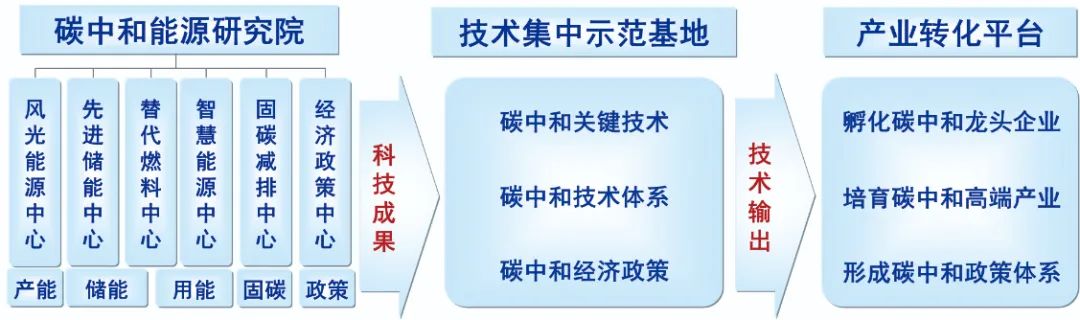 要想加速技術(shù)發(fā)展,我認(rèn)為還需要大幅度縮短技術(shù)研發(fā)到產(chǎn)業(yè)應(yīng)用的時(shí)間,探索技術(shù)研發(fā)-集中示范-產(chǎn)業(yè)轉(zhuǎn)化全鏈條貫通的新型研發(fā)組織模式。比如,可以聯(lián)合政府、企業(yè)與科研單位各方力量建立新型科研組織(圖1示),通過碳中和能源研究院組織跨學(xué)科的科研隊(duì)伍攻關(guān)碳中和新技術(shù),通過技術(shù)集中示范基地(圖2)促進(jìn)新技術(shù)間的協(xié)調(diào)融合發(fā)展,通過技術(shù)產(chǎn)業(yè)轉(zhuǎn)化平臺(tái)支撐成熟技術(shù)規(guī)?;瘧?yīng)用。最終,我們依托新型研發(fā)組織,貫通技術(shù)研發(fā)-集中示范-產(chǎn)業(yè)轉(zhuǎn)化的全鏈條,加速新技術(shù)的研發(fā)迭代。(記者 朱妍)