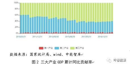 分產(chǎn)業(yè)看,10余年來,隨著我國經(jīng)濟(jì)結(jié)構(gòu)的轉(zhuǎn)型,三大產(chǎn)業(yè)對GDP的貢獻(xiàn)率發(fā)生明顯變化。2010至2019年,第三產(chǎn)業(yè)GDP貢獻(xiàn)率由39.7%上升至59.4%,增加接近20個百分點;第二產(chǎn)業(yè)GDP貢獻(xiàn)率由58.6%降至36.8%,下降21.8個百分點。三大產(chǎn)業(yè)貢獻(xiàn)率格局基本穩(wěn)定,第三產(chǎn)業(yè)成為拉動GDP的生力軍,其占比上升5.7個百分點;二產(chǎn)占比下降6.6個百分點。2019年,第三產(chǎn)業(yè)和城鄉(xiāng)居民生活用電量對全社會用電量增長的貢獻(xiàn)率達(dá)51.0%,比上年提高11.1個百分點,其中第三產(chǎn)業(yè)貢獻(xiàn)率比上年提高10.1個百分點,是支撐全社會用電量增長的主要動力。