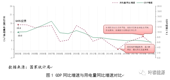 用電量與GDP增速具有較強(qiáng)的相關(guān)性。從GDP與用電量增速對比曲線圖可以看出,2003-2019年二者用電量走勢基本一致。2015年和2018年二者有些背離,一方面是經(jīng)濟(jì)增速進(jìn)入換擋期,動力轉(zhuǎn)換;另一方面是二者統(tǒng)計指標(biāo)調(diào)整時間上有些不一致。