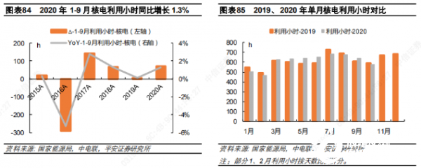 直至9月,年內(nèi)第一臺新投產(chǎn)機組田灣 5 號才實現(xiàn)商運。全國核電運行狀況持續(xù)向好,利用小時節(jié)節(jié)攀升,前三季度累計利用小時連續(xù)第四年實現(xiàn)增長。觀察單月的利用小時情況,除了 7、8、10三個月受創(chuàng)紀錄來水帶來的水電強勢壓制外,僅有 1、2 月受疫情影響導(dǎo)致利用小時低于上年同期。但從下降幅度來看,1-2月水、火、風利用小時降幅均超過 10%,而核電同比下降不到 7%,穩(wěn)健性凸顯無疑。