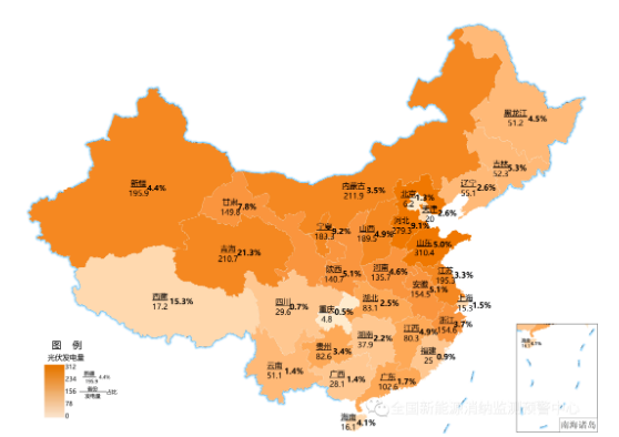 各地區(qū)2021年累計(jì)光伏發(fā)電量(億千瓦時(shí))及占本地區(qū)總發(fā)電量比重