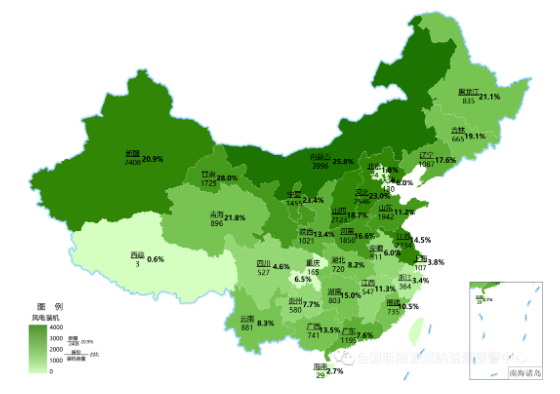 截至2021年底各地區(qū)累計(jì)風(fēng)電裝機(jī)(萬(wàn)千瓦)及占本地區(qū)總裝機(jī)比重