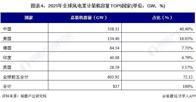 截至 2021 年底,全球風(fēng)電裝機(jī)總量 837GW,其中中國位居第一,裝機(jī)總量達(dá) 338.31GW,占世界總裝機(jī)容量的 40.40%; 美國風(fēng)電裝機(jī)總量為 134.40GW,占比為 16.05%,僅次于中國 ; 德國雖然在 2021 年新增裝機(jī)容量不是很多,但作為老牌風(fēng)電強(qiáng)國,累計裝機(jī)容量仍占了第三的位置,風(fēng)電裝機(jī)總量 64.54GW,占比 7.71%。印度和英國的裝機(jī)總量分別為 40.08GW 和 26.59GW,分別占比 4.79% 和 3.17%。中國和美國風(fēng)電累計裝機(jī)量占世界總裝機(jī)量的比例超過 50%,前五的國家占比超過 70%。