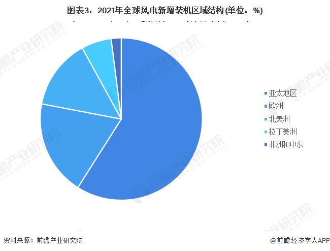 2021 年,亞太地區(qū)新增風(fēng)電裝機(jī)容量占全球新增裝機(jī)容量的比重達(dá)到了 59%,再次成為全球風(fēng)電增長引擎 ; 歐洲和北美洲新增風(fēng)電裝機(jī)容量占比分別為 19% 和 14%; 拉丁美洲占比 6%; 非洲和中東占比僅為 2%。