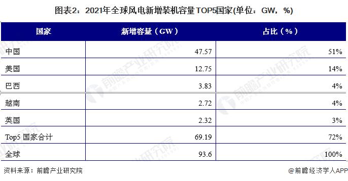 在全球風(fēng)電增速放緩的背景下,中國風(fēng)電裝機(jī)量有所回落。但 2021 年中國風(fēng)電新增裝機(jī)容量仍居全球第一,實(shí)現(xiàn)新增裝機(jī)容量 47.57GW,占全球新增裝機(jī)容量的 51%,其中陸上風(fēng)機(jī)裝機(jī)容量新增 30.67GW,海上風(fēng)機(jī)裝機(jī)容量新增 16.90GW; 其次為美國,新增裝機(jī)容量 12.75GW,占比 14%,全為陸上風(fēng)機(jī) ; 巴西和越南緊隨其后,均占全球風(fēng)電新增裝機(jī)容量的 4%; 英國新增裝機(jī)量 2.32GW,占比也達(dá)到 3%。五大國共計新增裝機(jī)量 69.19GW,占全球新增裝機(jī)量比重約 72%。