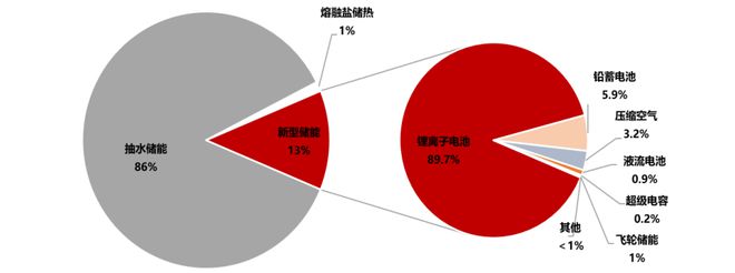目前蓄水儲能在我國仍舊占據(jù)主要地位,是國內(nèi)主要的儲能模式,但是以電化學(xué)儲能的發(fā)展規(guī)模正在快速追趕。截至2021年底,國內(nèi)86%的儲能市場由抽水儲能構(gòu)成,而新型儲能的占比達(dá)到13%。在國內(nèi)電化學(xué)儲能市場中,鋰離子電池占據(jù)絕對主導(dǎo)地位,市場份額達(dá)到 89.7%。