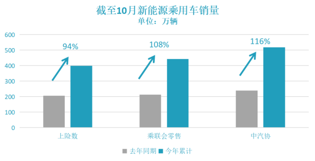 終端統(tǒng)計的上險數(shù)更為直接反映了市場狀況,1-10月總上險新能源乘用車399.47萬輛,同比增幅也達(dá)到了94%。