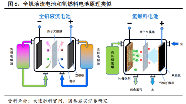全釩液流電池與氫燃料電池結(jié)構(gòu)與原理類似,電堆是系統(tǒng)的核心部件,是發(fā)生電化學反應和產(chǎn)生電能的場所,電解液或氫氣儲存在外部儲罐中。