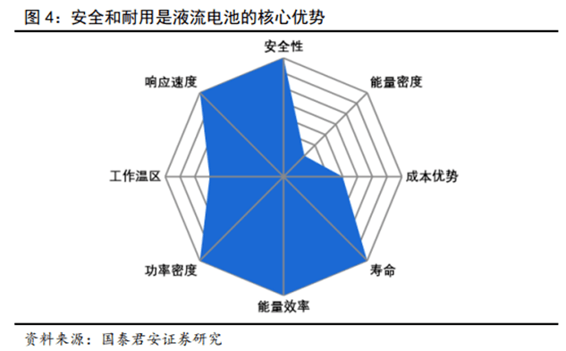 液流電池具備兩大核心優(yōu)勢:1)安全:從根本上避免爆燃,2)耐用:活性物質(zhì)衰減緩慢,工作壽命長達15-20年,加之儲能系統(tǒng)一般是靜態(tài)設施,對重量、體積的要求不高,能量密度并非關鍵指標,使得其尤其適合作為大規(guī)模儲能系統(tǒng)。
