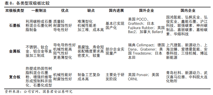 雙極板(BP):依材質可分為石墨雙極板、金屬雙極板和復合雙極板。氫燃料電池目前主要采用石墨板或金屬板,釩液流電池傾向復合板。國產(chǎn)化進程方面,石墨板基本已實現(xiàn)國產(chǎn)化,金屬板已有部分企業(yè)實現(xiàn)量產(chǎn),復合板尚處研發(fā)階段。