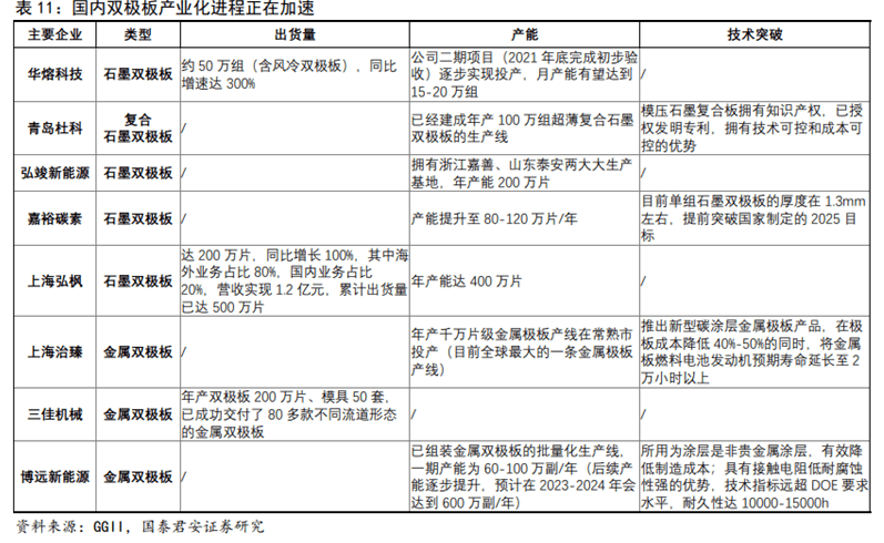 國(guó)內(nèi)產(chǎn)業(yè)化進(jìn)程正在加速:據(jù)GGII統(tǒng)計(jì),2021年期間,國(guó)內(nèi)主流雙極板企業(yè)出貨量增長(zhǎng)顯著,金屬雙極板領(lǐng)域已出現(xiàn)單個(gè)企業(yè)單個(gè)客戶出貨達(dá)百萬(wàn)片級(jí)別的現(xiàn)象;石墨板市場(chǎng)各家出貨也均有較大增長(zhǎng),表現(xiàn)明顯的是原萬(wàn)片級(jí)出貨企業(yè)的出貨量級(jí)達(dá)到10萬(wàn)片以上,頭部企業(yè)的出貨更是達(dá)到了50萬(wàn)片/年以上。
