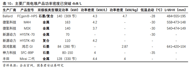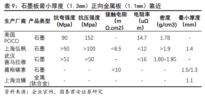 石墨板適應(yīng)需求趨于薄型化,乘用車為金屬板帶來(lái)機(jī)遇。石墨板:由于其高耐腐蝕性、高耐久性,以及相對(duì)較低的技術(shù)壁壘,率先實(shí)現(xiàn)國(guó)產(chǎn)化,在對(duì)體積較不敏感而對(duì)耐久性敏感的特種車、商用車領(lǐng)域示范應(yīng)用。然而,石墨雙極板的制作周期長(zhǎng)、機(jī)械性能差、加工難度大、制作成本高等劣勢(shì)也不可忽視。市場(chǎng)已有越來(lái)越多的企業(yè)成功開(kāi)發(fā)出超薄超精細(xì)石墨雙極板,提前突破了國(guó)家制定2025年前單組石墨雙極板厚度1.5mm的要求,功率密度開(kāi)始接近豐田第一代金屬雙極板的水平。金屬板:抗腐蝕性差,壽命過(guò)短是其應(yīng)用的阻礙,然而隨著涂層工藝的持續(xù)進(jìn)步與突破,其有望實(shí)現(xiàn)和石墨板相同的使用壽命。豐田汽車公司率先在旗下Mirai燃料電池汽車上使用金屬雙極板和涂層,解決了腐蝕、成本和導(dǎo)電等一系列問(wèn)題。憑借其機(jī)械性能優(yōu)異、高體積功率密度、成本低廉且易批量生產(chǎn)等優(yōu)勢(shì),金屬雙極板將在乘用車規(guī)模化應(yīng)用的進(jìn)程中實(shí)現(xiàn)突破。