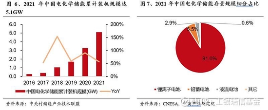 我國電化學儲能裝機規(guī)模持續(xù)高速增長,其中鋰電池儲能規(guī)模占比超九成。2021年,中國電化學儲能累計裝機規(guī)模5.1GW,同比增長56.5%,2016-2021年CAGR高達79.3%。其中,鋰離子電池儲能技術(shù)裝機規(guī)模4.7GW,裝機規(guī)模占比91.0%;鉛蓄電池儲能裝機規(guī)模0.3GW,占比5.5%;液流電池儲能技術(shù)裝機規(guī)模0.1GW,占比2.9%。