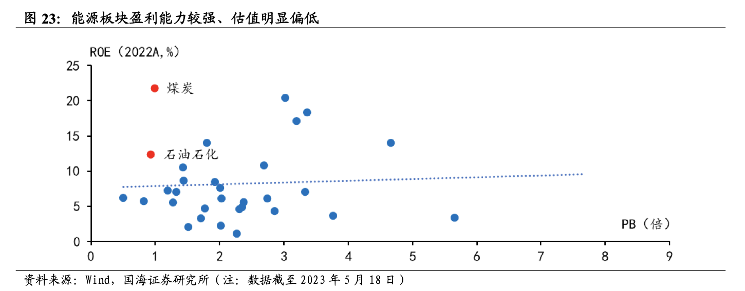 國海證券6月8日研報(bào)表示,能源板塊中上市公司擁有較為優(yōu)質(zhì)的基本面和偏低的市場(chǎng)估值,處于優(yōu)質(zhì)資產(chǎn)被低估的狀態(tài)。根據(jù)國海證券6月8日研報(bào)測(cè)算,截止到5月24日,石油石化、煤炭、公用事業(yè)2022年全年的ROE分別為12.32%、21.74%、5.59%,盈利能力較強(qiáng),且PB十年分位分別為 8.3%、35.9%、37.8%,能源是優(yōu)質(zhì)資產(chǎn)被低估的主要領(lǐng)域,調(diào)整過后仍具備性價(jià)比。