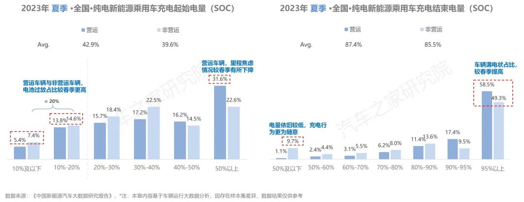 從充電開始電量上看,在夏季營運與非營運車輛均有相當(dāng)比例的車輛存在電池過放有害電池健康的現(xiàn)象,這一情況的比例較春季明顯增加。同時,在剩余電量在50%以上就開始充電的車主數(shù)量較春季有明顯下降,營運車輛與家用車輛車主對里程焦慮感有所減弱。