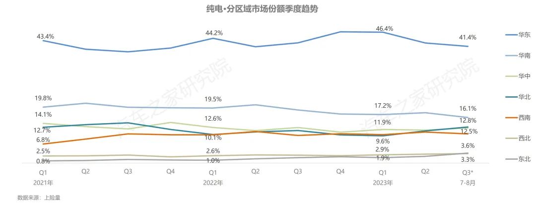 從區(qū)域角度上看,以長三角為代表的華東地區(qū)是中國發(fā)展的重要引擎,匯聚多個經(jīng)濟(jì)發(fā)達(dá)的省、市,更高的本地居民收入與完善的充電基礎(chǔ)設(shè)施配套,促使當(dāng)?shù)叵M者對新能源純電汽車更加旺盛的購車需求,其市場份額長期保持在40%以上,成為新能源純電車型最為重要的區(qū)域市場;華南地區(qū)以16%左右的份額位居第二;華中、華北、西南市場占比均在12%左右,份額十分相近;西北、東北市場占比尚不足5%。