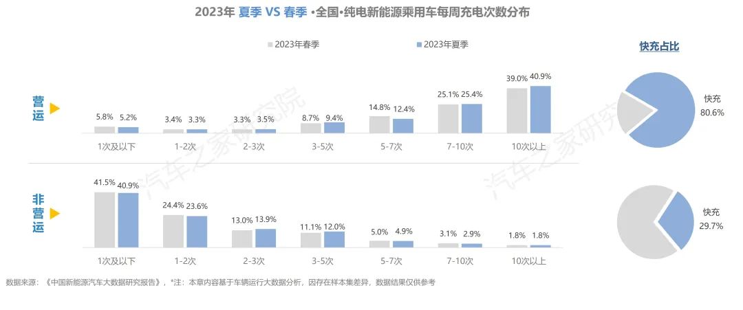 純電營運車輛每周充電超過7次的占比超過60%,且在所有的補能行為中,使用快充的占比高達(dá)80%。非營運車輛中超四成的車輛,每周僅充電1次,選擇快充方式補能的占比不足30%。
