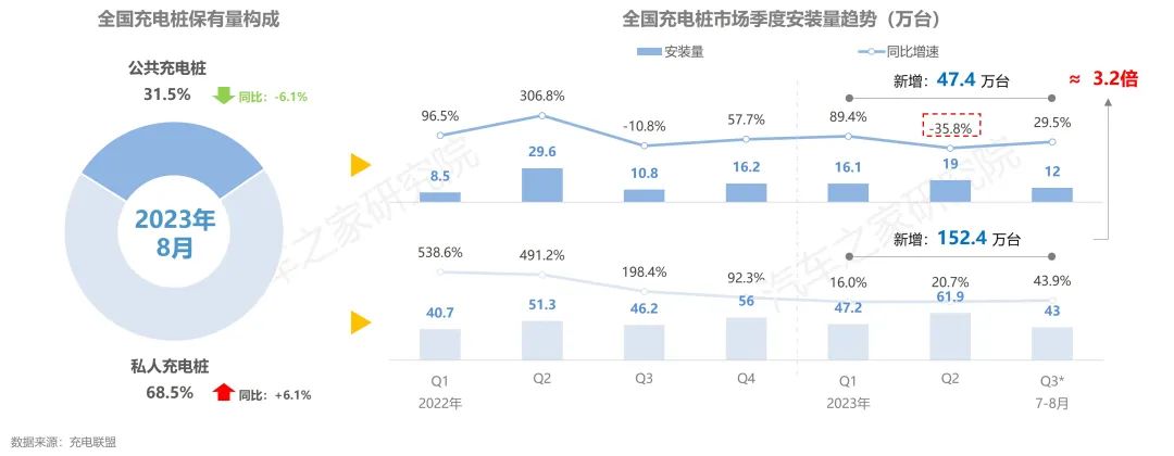 從結(jié)構(gòu)上看,私樁是目前新能源汽車補能的主要方式,占據(jù)充電樁近7成的保有量,而且發(fā)展增速更快。2023年1-8月,公共充電樁新增安裝47.4萬臺,7-8月安裝12萬臺,新增安裝量已超過去年整體Q3增量規(guī)模,恢復(fù)上行態(tài)勢,但其增量水平與整體規(guī)模,同私人充電樁規(guī)模相比差距增大。