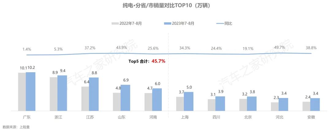 從省份角度看,在排名前五的省份中,廣東省是唯一銷量超過10萬輛的省份,繼續(xù)占據(jù)首位,排名第二至第五名的浙江、江蘇、山東、河南,五省合計占近50%的全國市場份額。排名前10的省份中,山東、河北省的市場成長性最為優(yōu)異,今年7-8月銷量同比增速近50%。