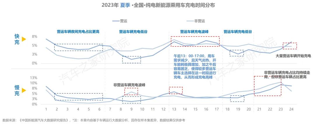 從充電開始時間上看,營運車輛在充電時,快充與慢充的波峰、波谷時間基本一致。早9時與晚19時是營運車輛充電的低谷,同時夜間充電比例更高。此外,由于午后用車需求減少,且夏季天氣炎熱,開車能耗大幅增加,加之午后容易困乏,使得較多車主選擇在下午13-17時進(jìn)行快充補能,從而形成充電高峰。當(dāng)選擇慢充進(jìn)行補能時,非營運車輛第一次充電高峰出現(xiàn)在上午9時而后快速回落,第二次是從19時開始一路攀升,至23時到達(dá)頂點,開始充電時間與營運車輛相比明顯更早。