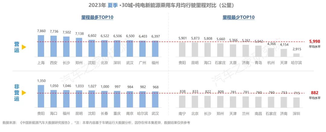 30個城市中,上海、西安等4個城市營運車輛月均行駛里程超過7000公里,與春季僅有兩個城市超7000公里相比,數(shù)量有所增加。非營運車輛行駛最多的是貴陽,月均里程超1300公里,遠(yuǎn)超其他城市,其余城市家用純電車型行駛里程差距較小,深圳私家車主跑的最少。