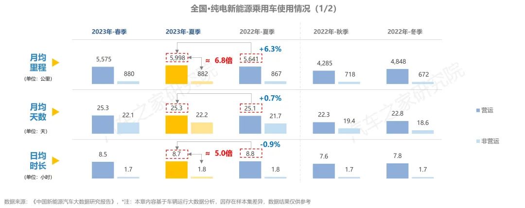 與去年同期相比,純電車輛在行駛里程有所增加,在出行天數(shù)與行駛時長方面,同去年夏季相比大體持平。而從不同車輛性質(zhì)對比上看,營運車輛的使用強度遠(yuǎn)超非營運車輛,兩者在行駛里程方面相差超6倍,在日均時長則亦有近5倍的差距。